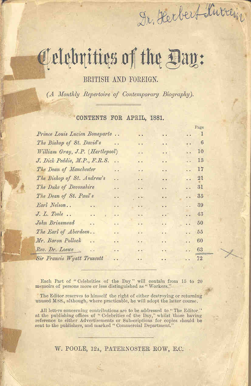 His connection with Sir Moses Montefiore, which, as anyone reading the diary of Lady Montefiore can see, was of the closest, secures him a second immortality, of which however, he does not stand in need. He was born at ZuIz, in Prussian Silesia, in 1809. He was educated at Rosenberg, in Silesia, subsequently at the Theological Colleges of Lissa, Nicholsburg and Pressburg, and at the University of Berlin. A desire to study Oriental languages led him from Berlin to London. There he became a naturalised British. subject, and was appointed in 1839 Hebrew lecturer and Oriental linguist to the late Duke of Sussex. In 1853 he was appointed principal of the Jews' College, then situated in Finsbury Square; in 1858 examiner for Oriental languages of the Royal College of Preceptors; and in 1868 principal and director of the Theological College at Ramsgate. But these last responsible positions were the distinctions of his maturity. The Duke of Sussex gave him letters to the professors at Cambridge, and Sir Francis Palgrave to those of Oxford. At both Universities he continued his studies. He then went to Paris, where he became a member of the Asiatic and Philological Societies, and was introduced to Admiral Sir Sydney Smith. Under his auspices he travelled much In the East, and acquired a full knowledge of the Arabic, Coptic, Nubian, Turkish, Persian and Circassian languages and literatures. At Alexandria lie delivered letters of introduction from Sir S. Smith to the Viceroy Mehemet Ali, for whom he translated some hieroglyphic inscriptions. Near Zafed, in the Holy Land,. he was ill-treated and robbed by the Druses, and so had to continue his journey disguised as a Bed'awee. On his return from the East, Dr. Loewe continued his studies at Rome There he met Sir Moses and Lady Montefiore, who invited him to accompany them on their journey to the Holy Land. This offer he accepted. Thenceforward he accompanied Sir Moses on nine of his Eastern missions, and also on those to Russia, Poland, Roumania, and Rome. Dr. Loewe was master of no less than thirty-nine languages. Among the products of his gigantic literary industry we may mention: