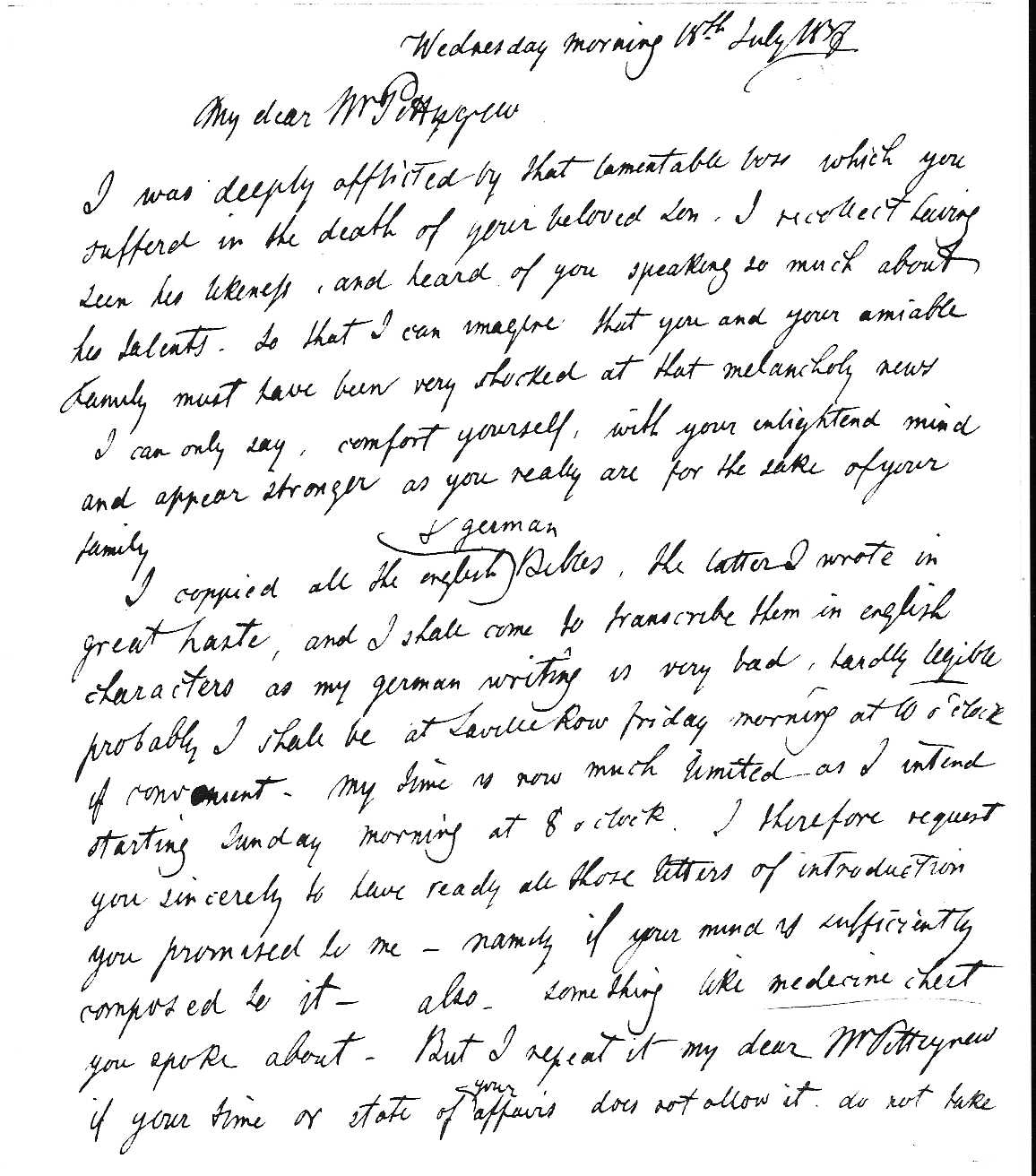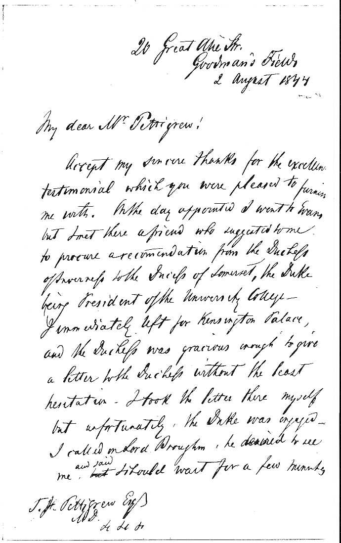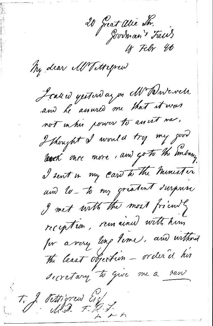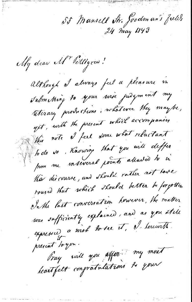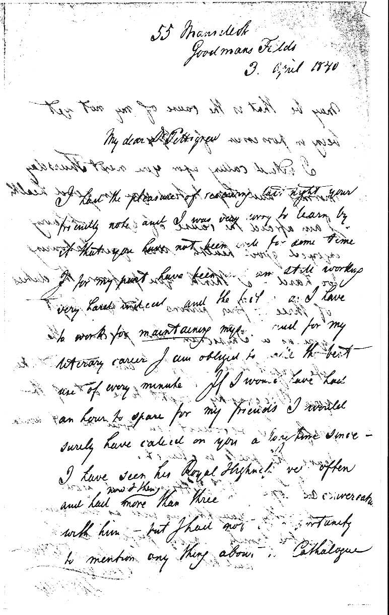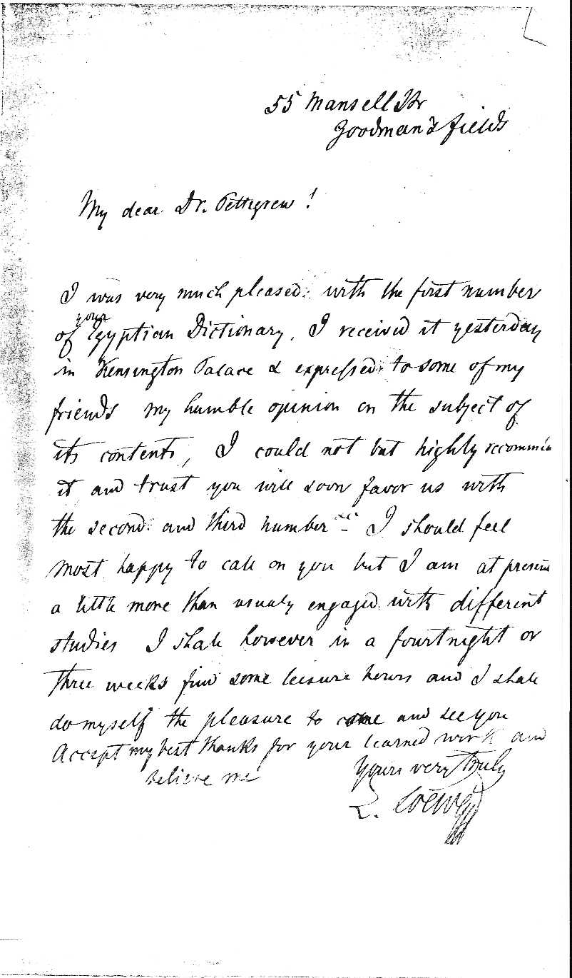 Loewe was also acquainted wih the surgeon Egyptologist (and theatrical "Mummy Unroller"!) James Pettigrew, to whom he turned for letters of introduction, testimonials and medical advice. Loewe's letters to Pettigrew are preserved in the Beinecke Rare Book and Manuscript Library of Yale University Library, to which I am grateful for the copies reproduced below. In 1839 he was appointed as the Duke Of Sussex's "Orientalist," but it is clear from these letters (1837? to 1846) that Louis was keen to secure further preferment. At the time he was living in London at Mansell Street, and later Great Alie Street, in the Jewish area to the East of the City of London, less than a mile from my present home. They make interesting, if difficult, reading.