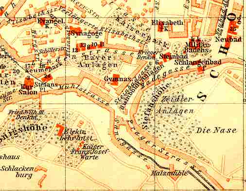In the late 19th century the Teplice Jewish community started to grow rapidly. In the 70s the Old Synagogue in the former ghetto did not succeed in housing all the faithful and thus the decision was made to erect a new synagogue that would accommodate the growing Jewish community and at the same time was able to represent it. The number of Jews in Teplice was increasing that time - in 1879 the consensus revealed the figure of 1718 persons of the Jewish creed and in 1890 the Teplice Jewish community with 1865 persons/members was the second largest community in Bohemia after Prague. In 1872 the Teplice Jewish Community succeeded in making a purchase of the Halas Family land, 5 071 m2 for 25 000 florins, which was situated in one of the most suitable places - on a hill which dominated, together with two other, the closest vicinity of the town of Teplice. Until the mid-17th century this hill was called Breite Stein (Široký vrch/Wide Hill), and later Judenberg (Jewish Hill), when in 1669 the original Jewish cemetery was relocated/transferred to this place. When soon after 1862 the cemetery was closed, the locality started to become a lucrative new housing development. At the very top of the hill, in close vicinity to the Jewish cemetery the Evangelical Church of St. Bartholomew was built in 1861-4; on the southern slope of the hill there was a path (later called Lípová Street) connecting the town of Teplice with Šanov and along this path new splendid villas started spring up.